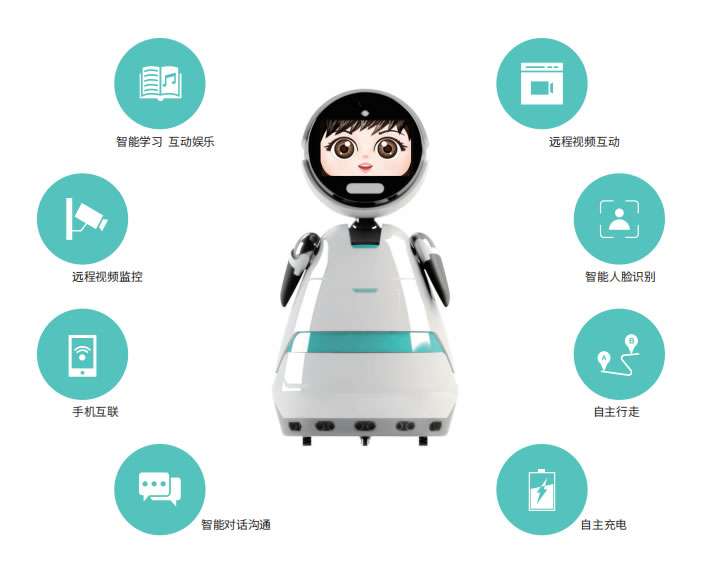 智能陪伴機(jī)器人采用機(jī)器人視覺系統(tǒng)、深度語音交互系統(tǒng)、先進(jìn)的語音引擎,搭載環(huán)形麥克風(fēng)陣列,運(yùn)用聲控識(shí)別、語義理解、人臉識(shí)別、情緒識(shí)別等關(guān)鍵技術(shù),在感知傳感器進(jìn)行穩(wěn)定準(zhǔn)確地行走、語音合成、理解與識(shí)別。機(jī)器人采用云平臺(tái)加本地化語音庫(kù)支持各種信息顯示,表情展示、觸摸輸入等人工交互過程。上位機(jī)采用 Linux 與 Android 操作系統(tǒng)通過串口方式與下位機(jī)通信,控制部分通過 Can 通信方式連接各種傳感器采集外部信息。整個(gè)軟件系統(tǒng)包括機(jī)器人端、服務(wù)器端、手機(jī)端,通過網(wǎng)絡(luò)通信方式完成機(jī)器人互聯(lián)。產(chǎn)品具備娛樂、早教、陪護(hù)、安防等功能,可用于家庭陪護(hù)教育及遠(yuǎn)程監(jiān)控防護(hù)。