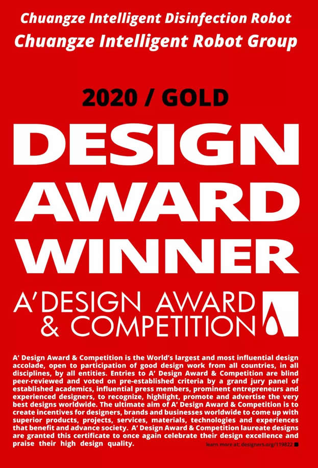 意大利A" Design Award是目前世界上大型的綜合性設計比賽,被譽為歐洲設計界的奧斯卡,是L先的國際年度設計賽事。也是ICSID(國際工業設計協會)、ICOGRADA(國際平面設計協會)、ADI (意大利工業設計協會)所認可的國際設計賽事。 2020年至2021年,意大利A" Design Award設計大賽共收到來自2萬余件設計作品,所有參賽作品都是通過來自世界各地的學者、新聞界人士、設計師同行和行業專家所組成的頗具規模、影響力的設計獎評審團進行評審。此次,創澤集團智能消毒殺菌機器人在眾多設計作品中脫穎而出榮獲意大利A"Design Award金獎,代表著設計界至G榮譽,讓創澤集團的設計作品閃耀于國際舞臺,同時也證明了創澤品牌在市場上的核心競爭力。