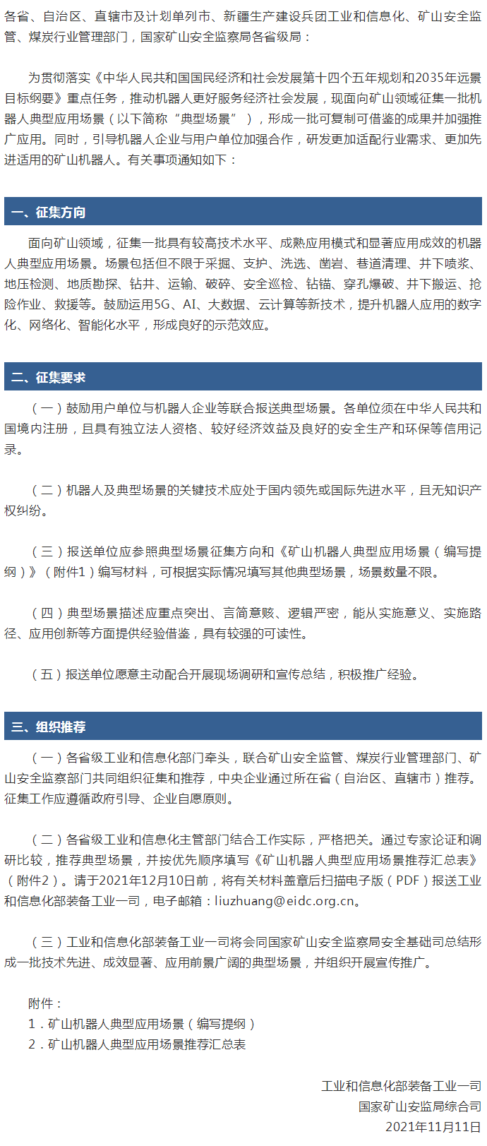 面向礦山L域,征集一批具有較G技術(shù)水平、成熟應(yīng)用模式和顯著應(yīng)用成效的機(jī)器人典型應(yīng)用場(chǎng)景。場(chǎng)景包括但不限于采掘、支護(hù)、洗選、鑿巖、巷道清理、井下噴漿、地壓檢測(cè)、地質(zhì)勘探、鉆井、運(yùn)輸、破碎、安全巡檢、鉆錨、穿孔爆破、井下搬運(yùn)、搶險(xiǎn)作業(yè)、救援等。鼓勵(lì)運(yùn)用5G、AI、大數(shù)據(jù)、云計(jì)算等新技術(shù),提升機(jī)器人應(yīng)用的數(shù)字化、網(wǎng)絡(luò)化、智能化水平,形成良好的示范效應(yīng)。