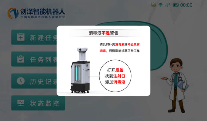 消毒機器人的屏幕還可以顯示消毒機器人運行過程中的狀態提醒,如上圖所示,當消毒機器人的消毒液不多的時候,會在屏幕顯示添加消毒液的提醒信息。