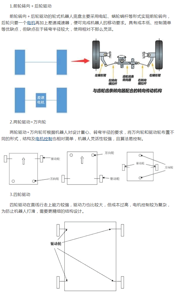 輪式機器人底盤主要有前輪轉向后輪差速驅動、兩輪驅動+萬向輪、四輪驅動之分。
