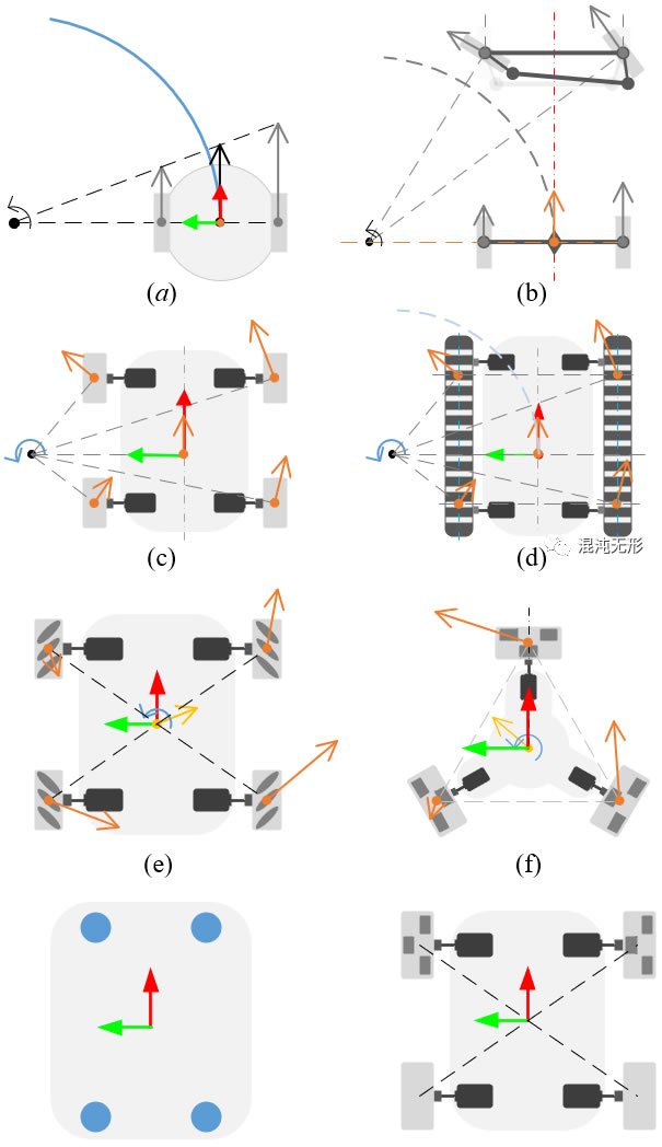 圖 2.3(g)中的四個藍色原點表示舵輪的位置,上述談到每個舵輪有兩個電機,分別控制輪子滾動和轉向,因此這種類型的機器人也被稱為四驅四轉移動機器人。