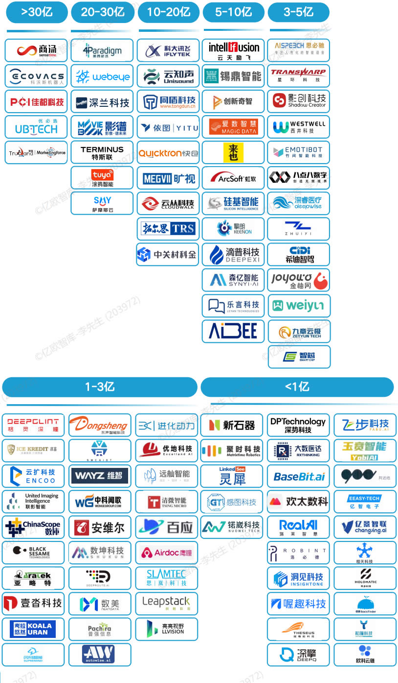 安維爾 八點(diǎn)八數(shù)字 創(chuàng)新奇智 格靈深瞳 雙太數(shù)科 進(jìn)化動(dòng)力 科大訊飛 曠視科技 樂(lè)言科技 商湯科技 深蘭科技 特斯聯(lián) 涂鴉智能 云天勵(lì)飛 云從科技