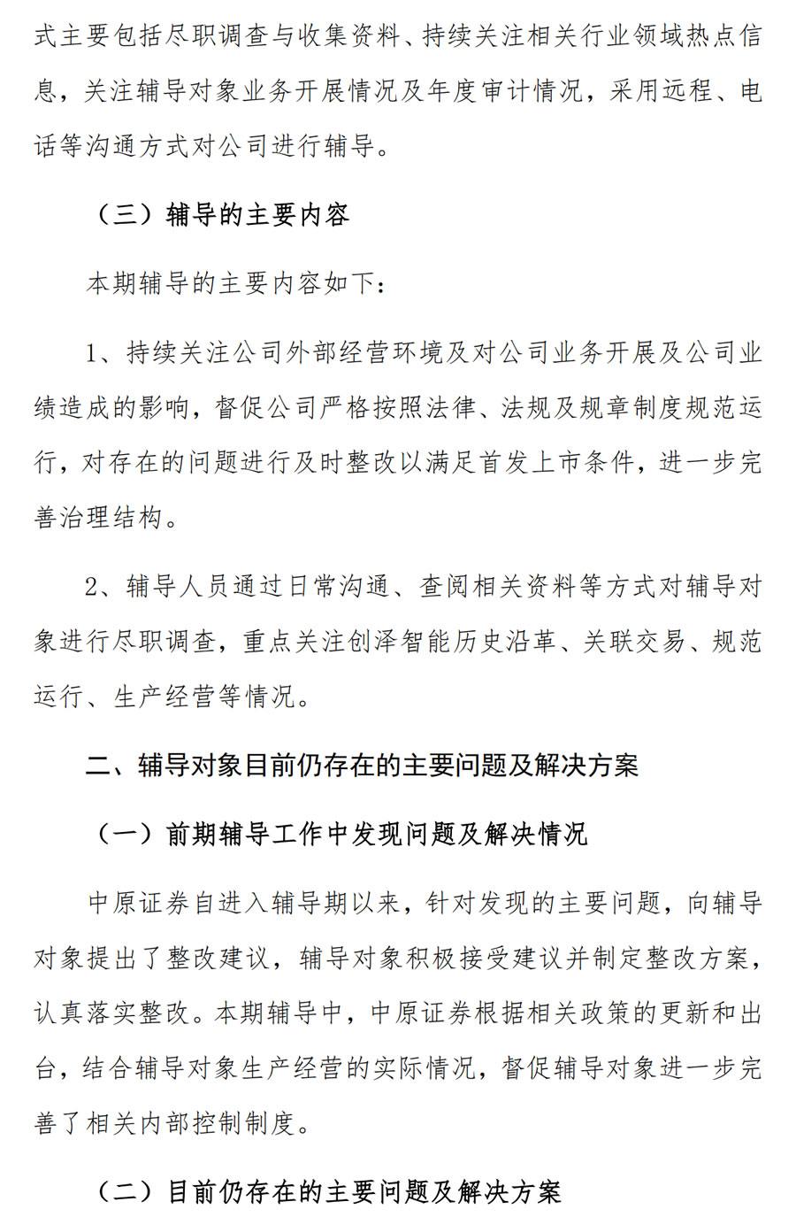 2、輔導人員通過日常溝通、查閱相關資料等方式對輔導對象進行盡職調查,重點關注創澤智能歷史沿革、關聯交易、規范運行、生產經營等情況。