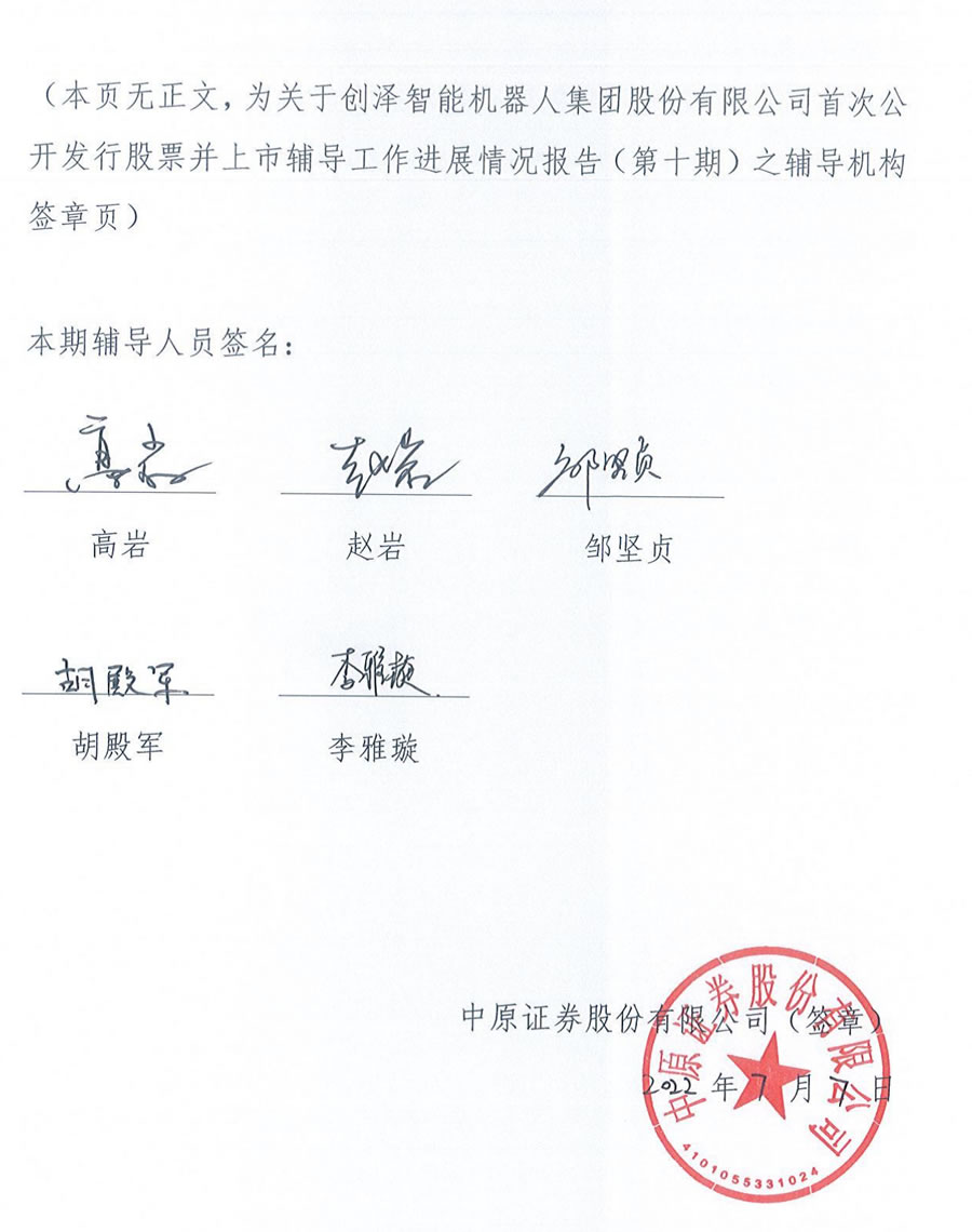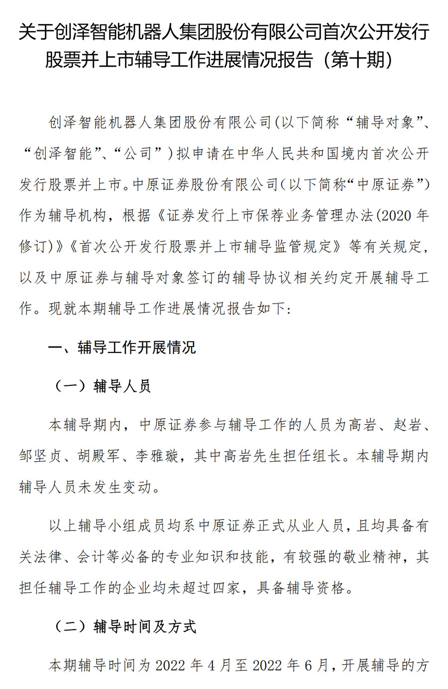中原證券關于創澤智能機器人集團股份有限公司首次公開發行股票并上市輔導工作進展報告