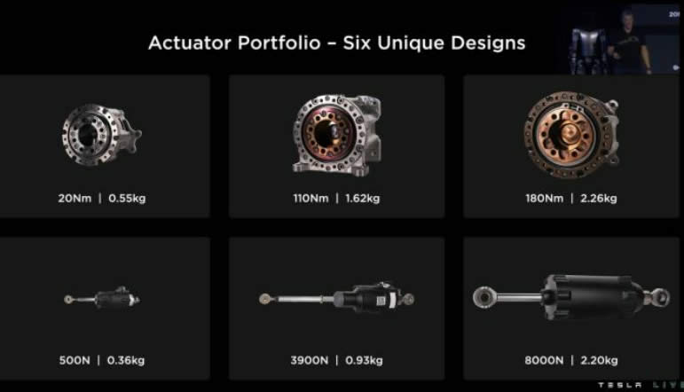 電機驅動上,“擎天柱”擁有 2.3KWH、52V 電壓的電池組,內置電子電器元件的一體 單位,支持人形機器人工作一整天;選用 28 個定制關節驅動器,復用汽車動力總成設計經 驗,設計 6 種關節驅動器,包括 3 種不同規格的舵機(采用諧波減速器)和 3 種不同規格 的直線執行器(采用永磁電機,可抬動 1.5 噸三角鋼琴的),找到成本與效率的佳組合。