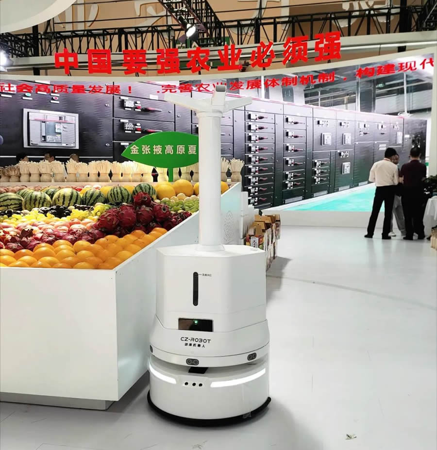 創澤智能霧化消毒機器人采用超聲霧化各種消毒液,并通過G速氣流將霧化后的霧滴彌散到消毒區域實現消毒。