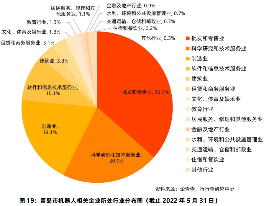 從機(jī)器人產(chǎn)業(yè)鏈相關(guān)企業(yè)所處行業(yè)來(lái)看,截至 2022 年 5 月,青島市機(jī)器人相關(guān)企 業(yè)中,有 36.5%的企業(yè)從事批發(fā)和零售業(yè);其次為科學(xué)研究和技術(shù)服務(wù)業(yè),占比為 20.9%; 制造業(yè)、軟件和信息技術(shù)服務(wù)業(yè)占比分別為 19.1%和 10.1%。從行業(yè)分布結(jié)構(gòu)可以看出, 青島市機(jī)器人相關(guān)企業(yè)多布局在零部件及終端產(chǎn)品銷售、科研技術(shù)服務(wù),以及工業(yè)制造 L域,而消費(fèi)級(jí)的服務(wù)型機(jī)器人未來(lái)將有著廣闊的市場(chǎng)空間。