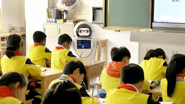 學(xué)校智能教育機器人正在課堂上與學(xué)生們一起上課。