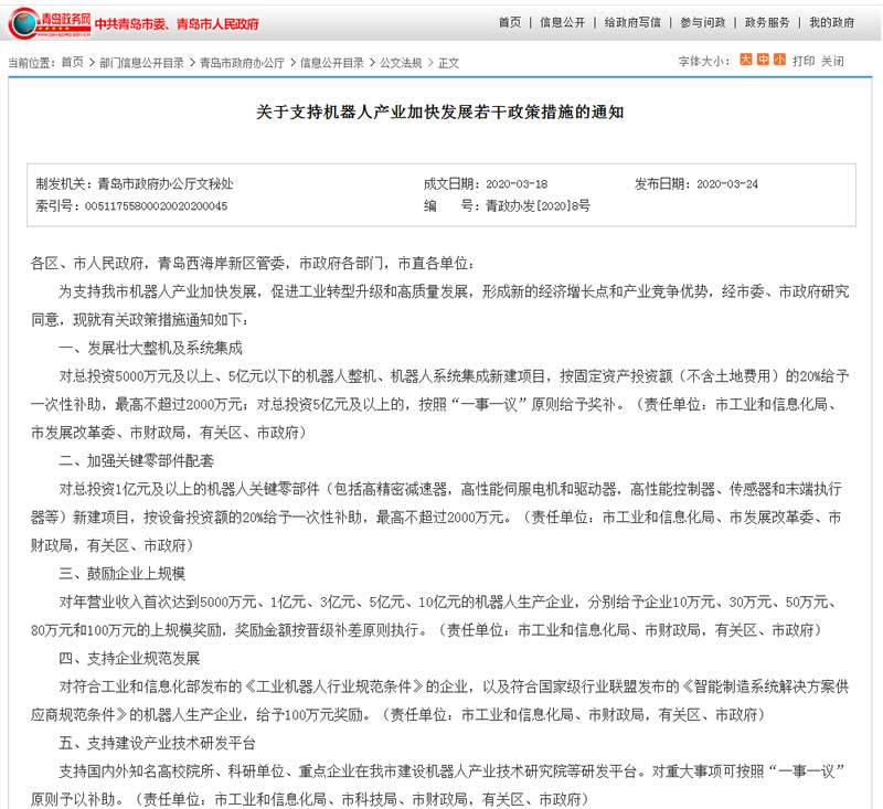 2020年3月18日,青島市政府辦公廳印發(fā)《關(guān)于支持機(jī)器人產(chǎn)業(yè)加快發(fā)展若干政策措施的通知》,出臺(tái)支持機(jī)器人產(chǎn)業(yè)發(fā)展的6大方面10條措施。這是山東省內(nèi)出臺(tái)的D一個(gè)機(jī)器人產(chǎn)業(yè)政策,其政策優(yōu)惠力度在全國(guó)J具競(jìng)爭(zhēng)力。其中,在引進(jìn)培育機(jī)器人整機(jī)及系統(tǒng)集成企業(yè)、鼓勵(lì)產(chǎn)品研發(fā)等方面,該政策創(chuàng)新力度實(shí)現(xiàn)新突破。