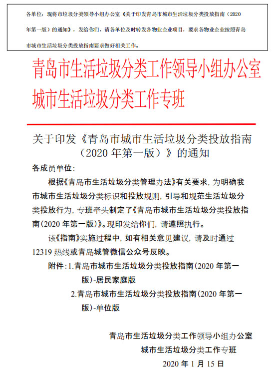 根據《青島市生活垃圾分類管理辦法》有關要求,為明確我市城市生活垃圾分類標識和投放規則,引導和規范生活垃圾分類投放行為,專班牽頭制定了《青島市城市生活垃圾分類投放指南(2020 年D一版)》。現印發給你們,請遵照執行。
