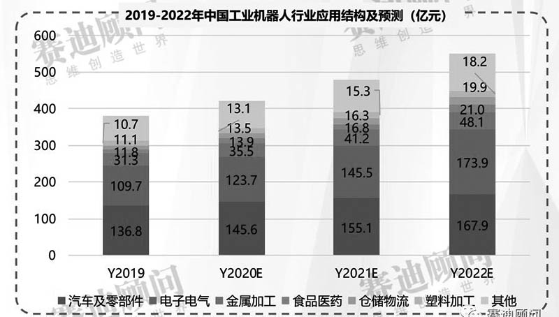 未來三年,工業(yè)機(jī)器人行業(yè)應(yīng)用結(jié)構(gòu)的總體格局基本保持不變。到2022年,汽車及零部件、電子電氣仍然占據(jù)大比重,隨著制造業(yè)轉(zhuǎn)型升級進(jìn)程的不斷加速,將為金屬加工、食品醫(yī)藥、倉儲(chǔ)物流等應(yīng)用行業(yè)帶來更大的市場空間。